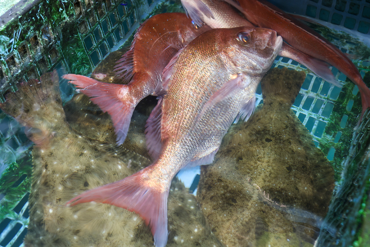 完全閉鎖型の東京・豊洲市場で、水産卸売場棟1階西側に唯一、半開放型で整備されたエリアがある。水槽約50基が立ち並ぶ “活け場” と呼ばれる活魚売場だ。常時20種類以上入荷する天然物のほぼ全量をセリ売りしている。