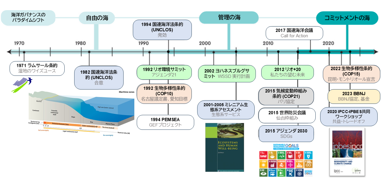 まさに、その時代にUNCEDが開催され社会開発と人間開発を統合した「持続可能な開発」が中心に据えられたのです。1992年のUNCED(リオ環境サミット)の成果文書「アジェンダ21」は、海洋および海洋資源の保護・利用に対して大きな影響を与えた歴史的な文書であり、持続可能な開発を追求するための国際的な基盤を提供したのです。アジェンダ21には、目標としての「持続可能な開発」だけでなく、その実現のため「予防的アプローチ」「生態系アプローチ」「生物多様性の保全」といった新たな手段が提示されました。これらの考え方は、その後のリオ+20の「われわれの望む未来(Future We Want)」に継承され、SDGsやBBNJといった国際的な目標・枠組み作りに反映されています。