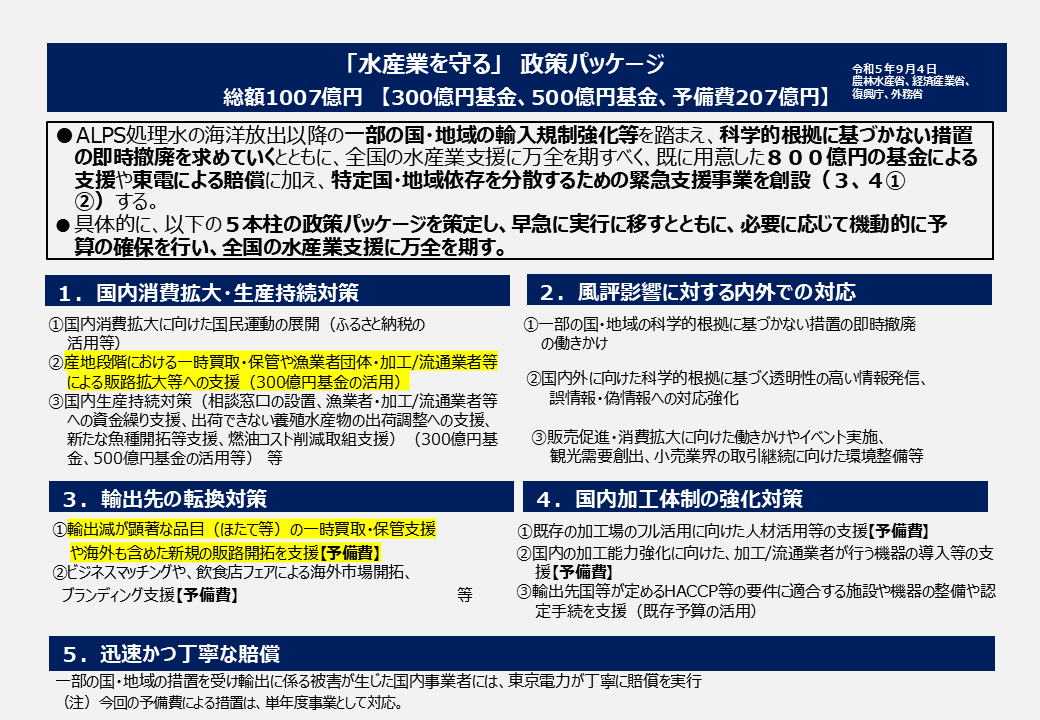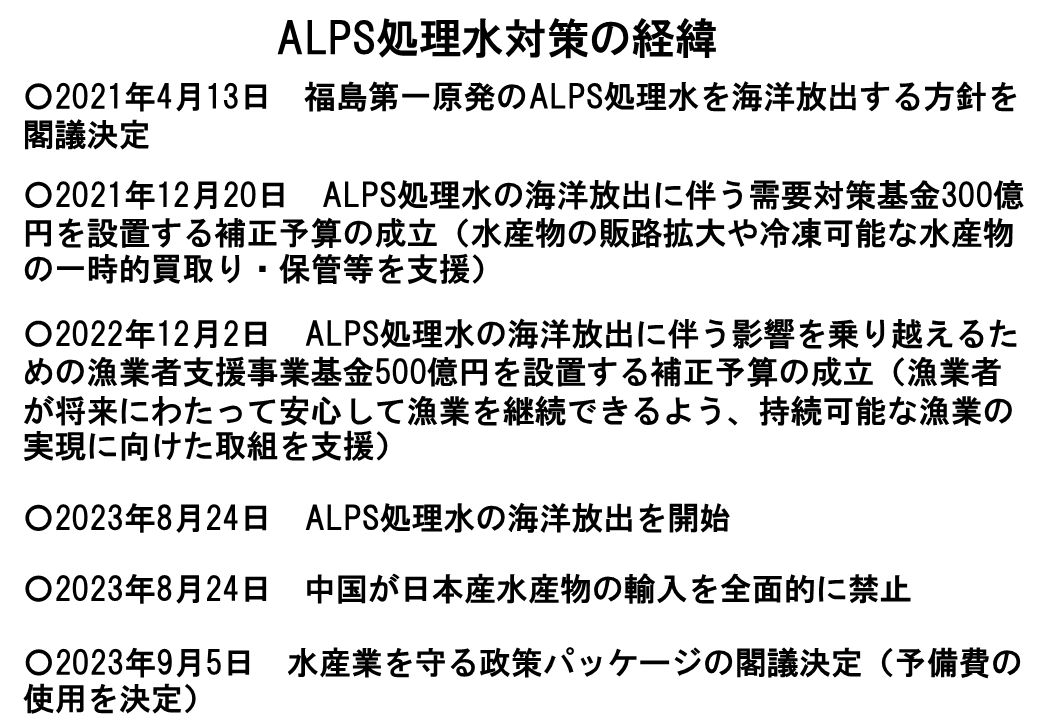まず2021年に海洋放出の方針が決まりました。その後、21年の12月の補正予算で300億円基金ができ、その翌年には500億円基金というものができて、かなりの金額の基金が用意されたわけです。そして23年の8月にALPS処理水の海洋放出が開始され、即日、中国が輸入を全面的に禁止するということで、これは私も非常に驚いたのですが、極めて短期間で、すなわち8月24日の中国による禁輸措置から間もない9月5日には「水産業を守る」政策パッケージが閣議決定されました。