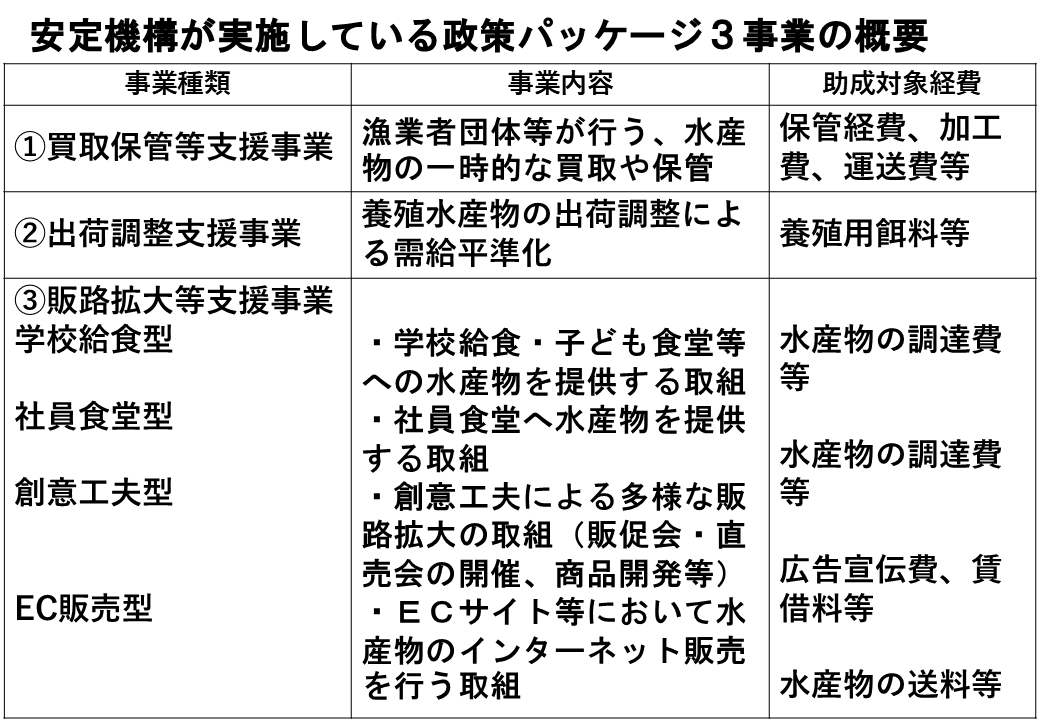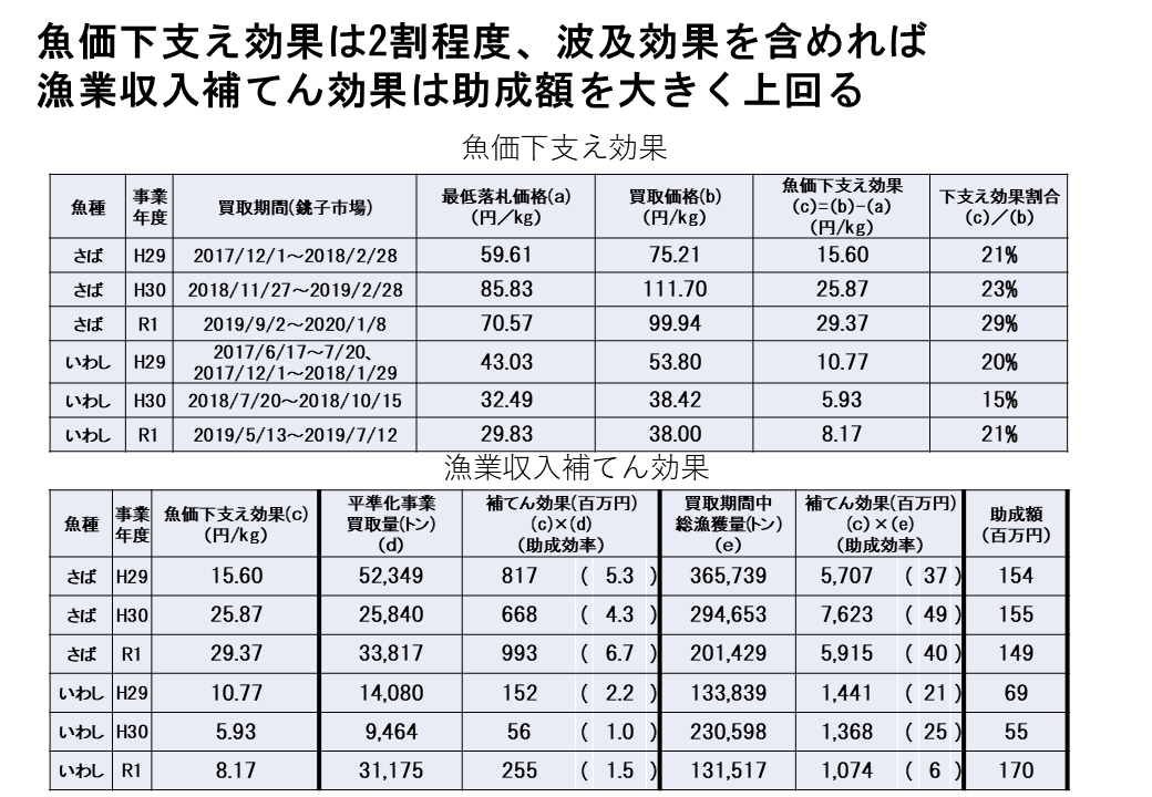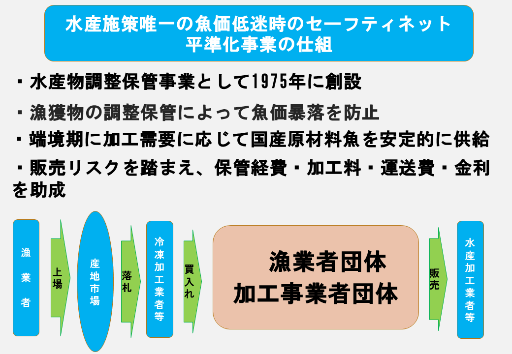 もちろん、加工事業者に対する原材料魚の安定供給も非常に重要な公益的な目的を持っているわけですが、水産物を保管して、加工して、運送している人は多くいます。あまたいる中で漁業者団体なり加工事業者団体にこうした経常経費を補助するというのは、入り口のところで魚価安定、水産物が供給過剰になった時に限って値段が落ちることを防ぐために実施するというところで、入り口と出口の両方に政策目標があるので、こういった事業が実施できています。