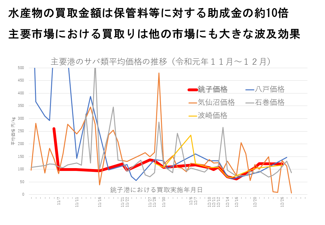 このグラフは銚子漁港とそれ以北の太平洋岸の主要漁港におけるサバの産地価格の推移を比較したもので、太く赤い折れ線が銚子魚市場でのサバの産地価格です。令和元年の11~12月に銚子市場で業者が買い取りをし、価格の下支えを行いました。その間の気仙沼や石巻など他の漁港での価格の振れ幅は大きいのですが、いずれも銚子の価格によりある程度下げ止まっていることが分かると思います。当然ながら、他港よりも浜値が安いとなれば値段の良い港に水揚げが奪われてしまいますから、調整保管により銚子で浜値を下支えすることで他の港にもその効果が波及するという事業です。