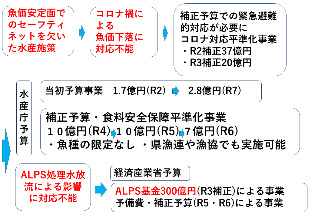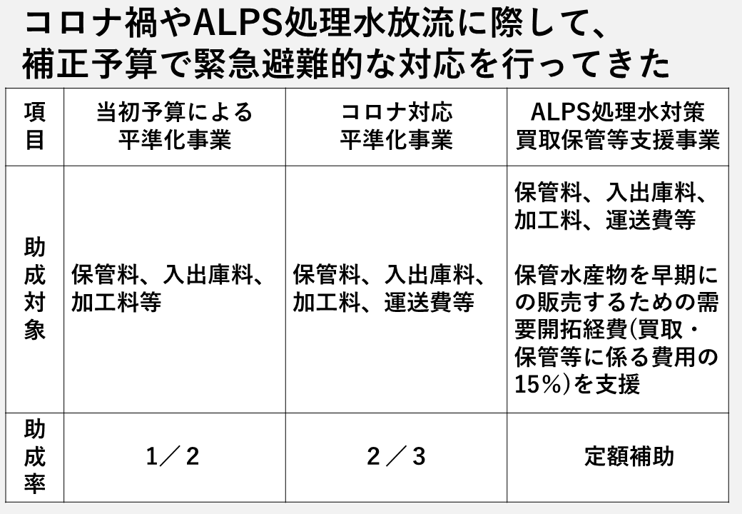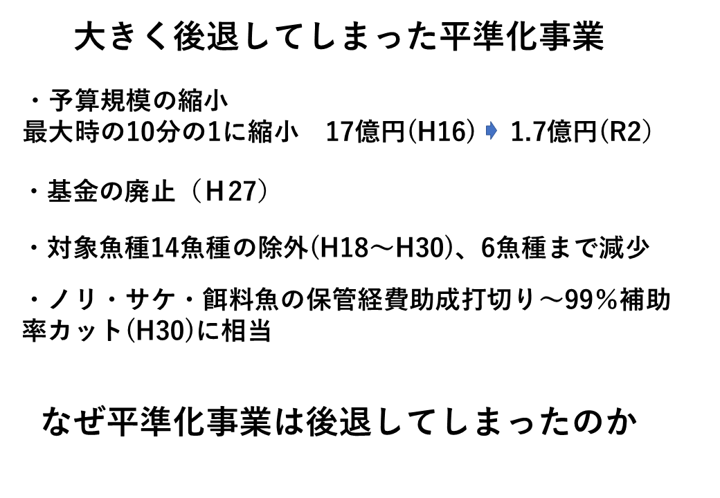 最後に、これが一番大きいのですが、基金が廃止されたということで、基金方式は真に必要な事業に絞り込むべきということですが、これは先ほど申し上げたように、魚価が下落しなければ使えませんから、そもそも使い切るタイプの予算ではないです。また、水揚げが集中する時に買い取り、端境期に売り渡しますので、年度と関係なく行う事業ですので、そういった点が一切無視をされてしまったということです。