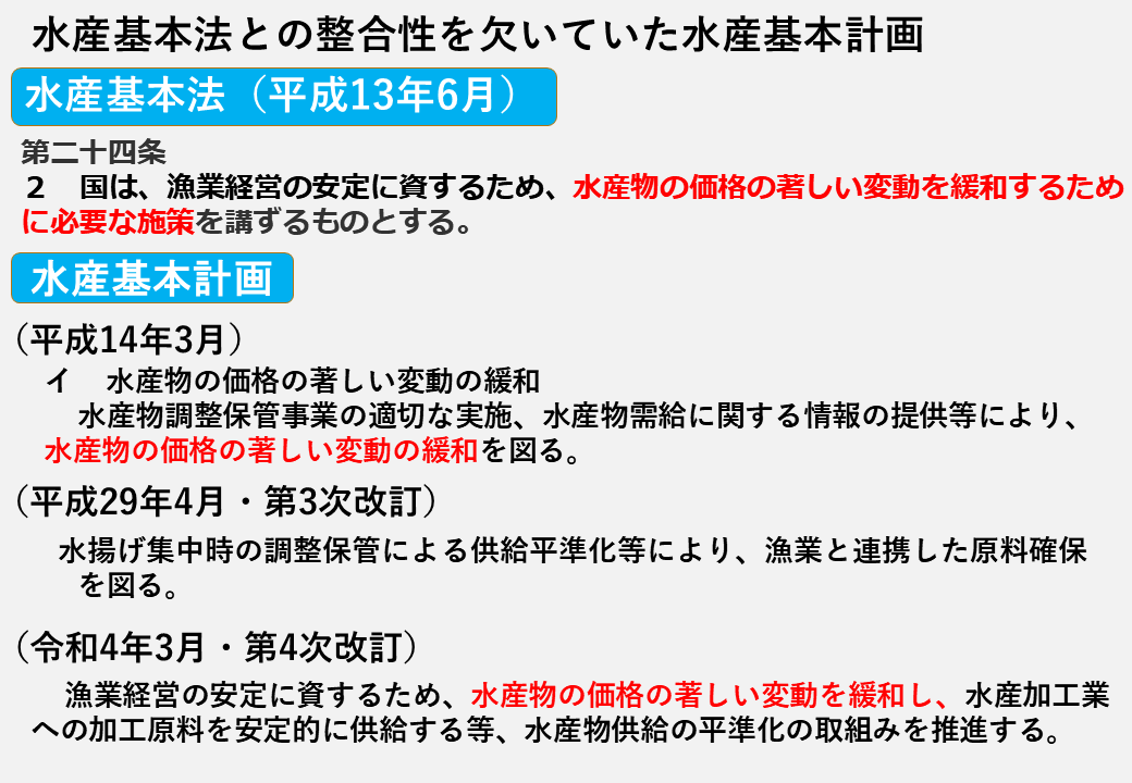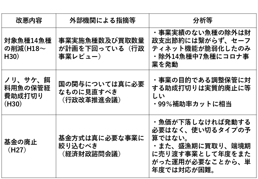 例えば、対象魚種の14魚種削減に関する指摘は、計画どおり買い取りが行われていないというものでした。しかし、そもそもこの事業は価格が下がった時だけ使う事業ですから、下がらなければ当然使わないわけです。従って、計画どおりにいく事業ではないのですが、そうした見当外れの指摘がまかり通ってしまったということです。さらには、計画どおり使っていないのであれば財政支出はないわけですから、何ら財政支出の節約にはつながらずに、セーフティネット機能が脆弱化したというものです。