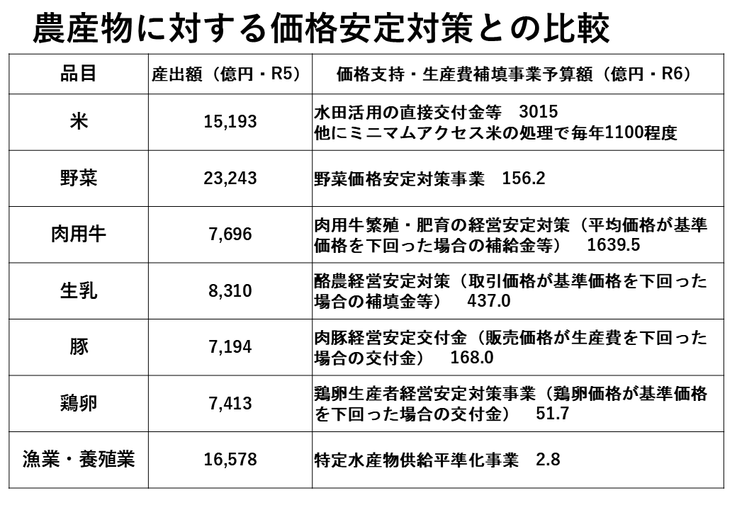 野菜、肉用牛、生乳、豚、鶏卵、それぞれについても極めて手厚い対策が講じられています。例えば、野菜は確かに漁業・養殖業より産出額が大きいですけれども、野菜価格安定対策事業として価格補塡や産地廃棄などに156億円。さらに畜産業は非常に補助が手厚く、金額的に比較対象にもなりません。それらに比べると漁業・養殖業は直近の当初予算が2.8億円で、どう考えても全く十分とは言えない状態です。