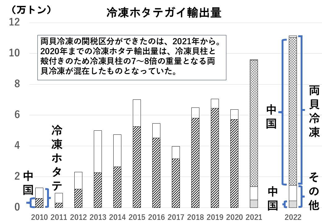 グラフの右端に記した両貝冷凍とは、殻付きのまま冷凍したホタテですが、近年では中国向け輸出(グラフの網掛部分)のほとんどがこの品目です。急激に増えてきましたので、両貝冷凍として関税分類が独立したのも2021年からです。そのため、2020年までは冷凍貝柱などの加工品と両貝冷凍とが混在した量となっていて、貝柱の7~8倍以上の重さがある貝殻部分の重さも含まれているわけです。