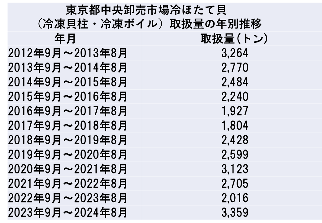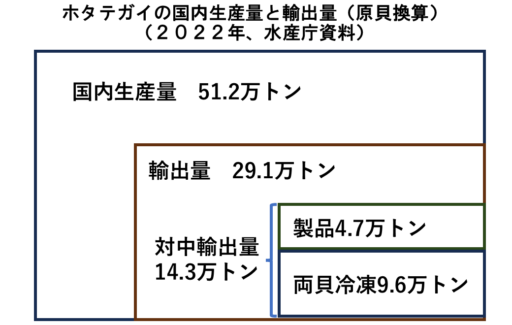 しかし。元々は製品形態の輸出は、冷凍貝柱や干し貝柱などが主体でした。いろいろ調べてみると、中国はいまだに世界最大のホタテガイ類(イタヤガイ等を含む)の生産国ですけれども、2009年ごろから中国が国内の減産により加工原料が不足したことで、日本からの輸入を開始したということで、2010年以降、加工原貝として両貝冷凍の輸出が伸びていき、15年ころには5万トン程度に達していたといわれています。