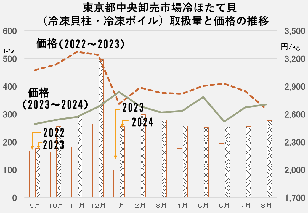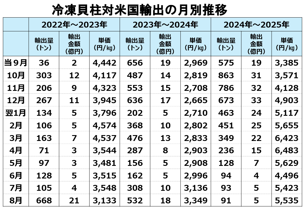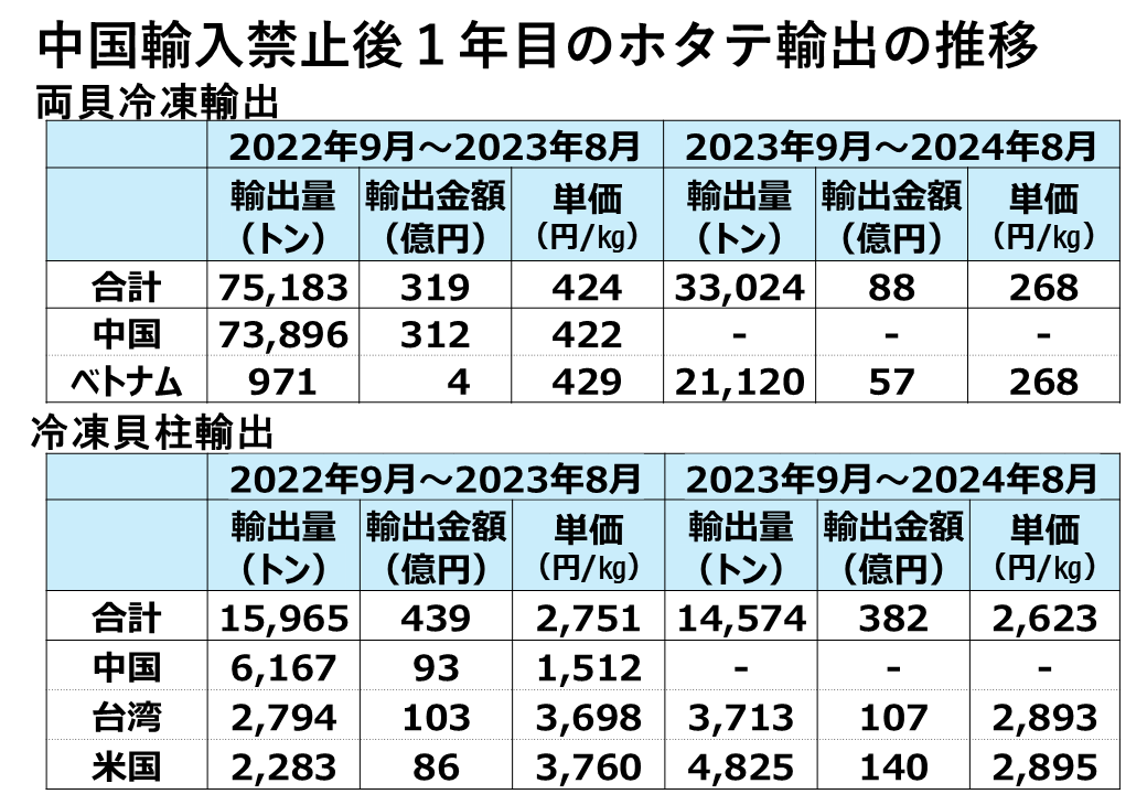 中国が輸入を止めたのが23年の8月24日ですので、9月を起点として、2022年9月から翌年の8月まで、そして中国が輸入を止めた2023年の9月から24年の8月までを比べています。まず、両貝冷凍について見ると、中国へは輸出が止まった替わりにベトナムへの輸出量が20倍以上に急増しました。とはいえ、前年の中国への輸出量をカバーできる量ではありません。特にキロ単価ですが、420円台であったのが300円を切ってしまい、大きく落ちています。投げ売りも行われたと伝えられています。冷凍貝柱の輸出については、量的にはそれほど下がっていないのですが、キロ単価を見ていただくと、中国に行っていた安価なものがなくなったのですが、台湾や米国向けのキロ単価でも、3,700円前後だったのが3,000円を切るということで、やはり供給がだぶついたため買いたたかれた結果の価格低下ということだと思います。