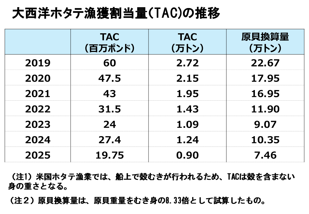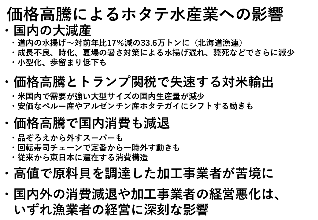 まず国内で大きく減産をしているため価格が高騰し国内消費が減退しています。また価格高騰とトランプ関税の影響で対米輸出が失速しています。こうした状況において、高値で原料貝を調達した加工事業者が苦境に直面していると思います。そして加工事業者の経営悪化がいずれ漁業者の経営にも深刻な影響を与えることにならないか懸念されるところです。