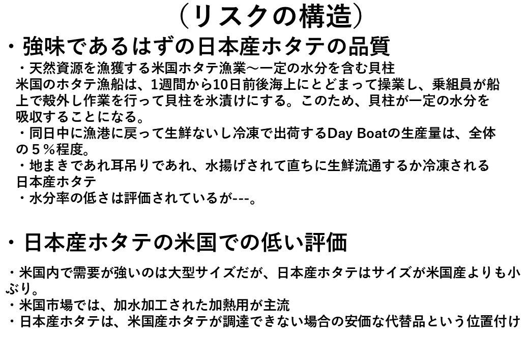 ここでは、3点目について、強みであるはずの日本産ホタテの高品質が十分に活かされていない点を指摘したいと思います。